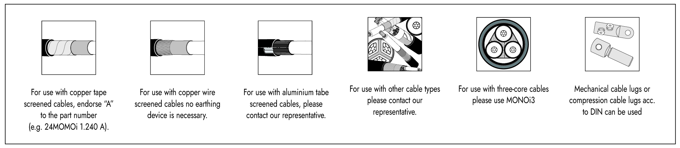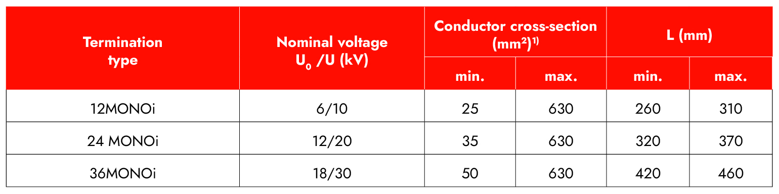 Teplem smrštitelná koncovka MONOi je určena pro vnitřní použití na jednožilových vysokonapěťových kabelech s plastovou izolací a se snadno sloupatelnou vytlačovanou vodivou vrstvou nebo nesloupatelnou vytlačovanou vodivou vrstvou. Je vhodná pro kabely stíněné měděnými drátky nebo měděnou páskou.