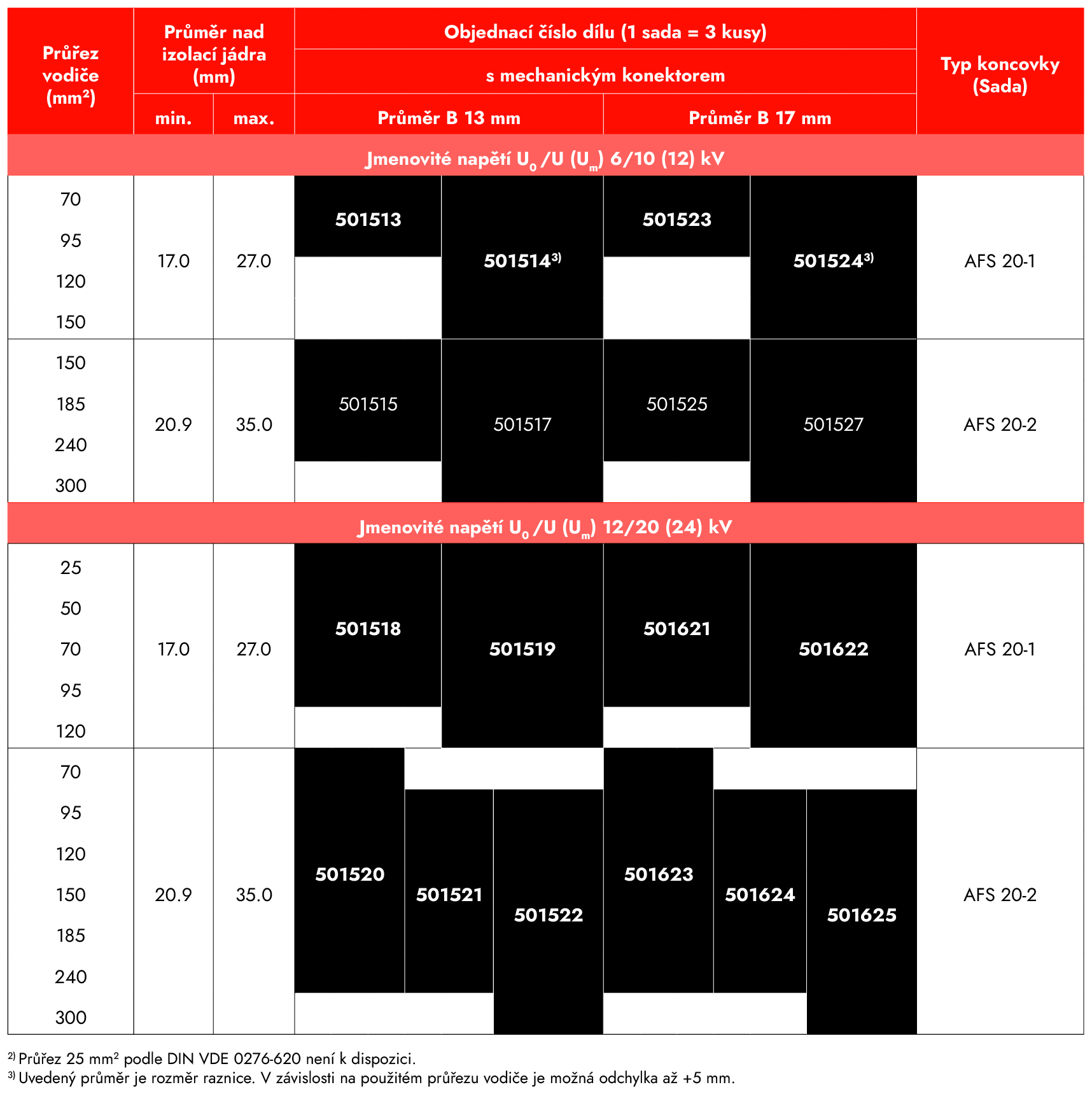 1 sada AFS 20 pro 12/20 kV, pro 70–240 mm² s mechanickým kabelovým okem (průměr otvoru 13 mm).