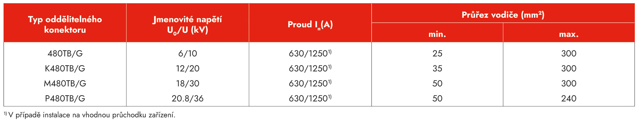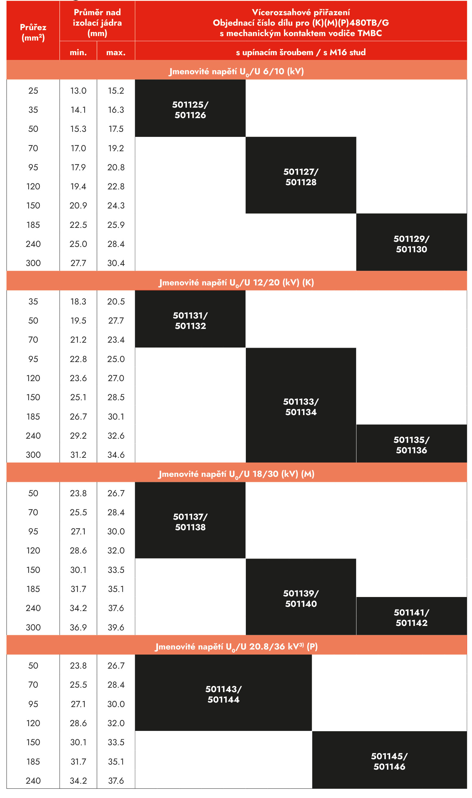 3) Vzhledem k tomu, že rozměry kabelů pro napěťovou hladinu 20,8/36 (42) kV ještě nejsou standardizovány, průřezy vodiče a přiřazené průměry nad izolací jádra uvedené v tabulce je třeba považovat za přibližné hodnoty. Při objednávání příslušenství uveďte ověřené průměry nad izolací jádra.