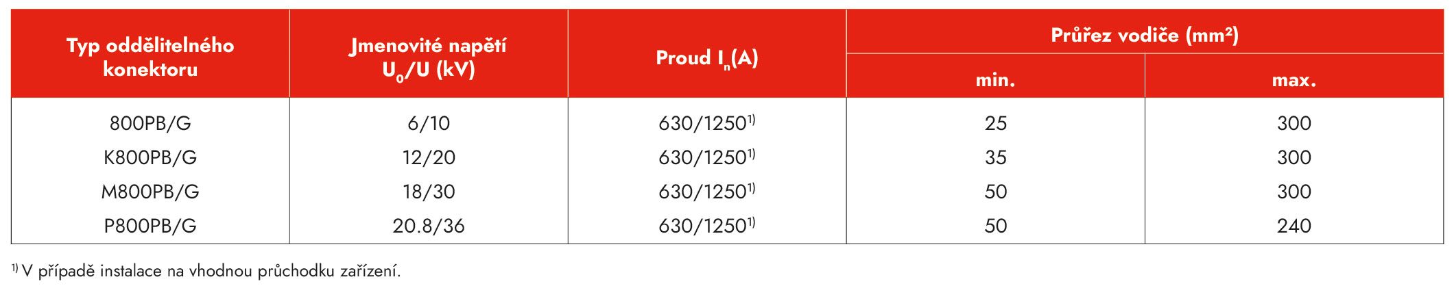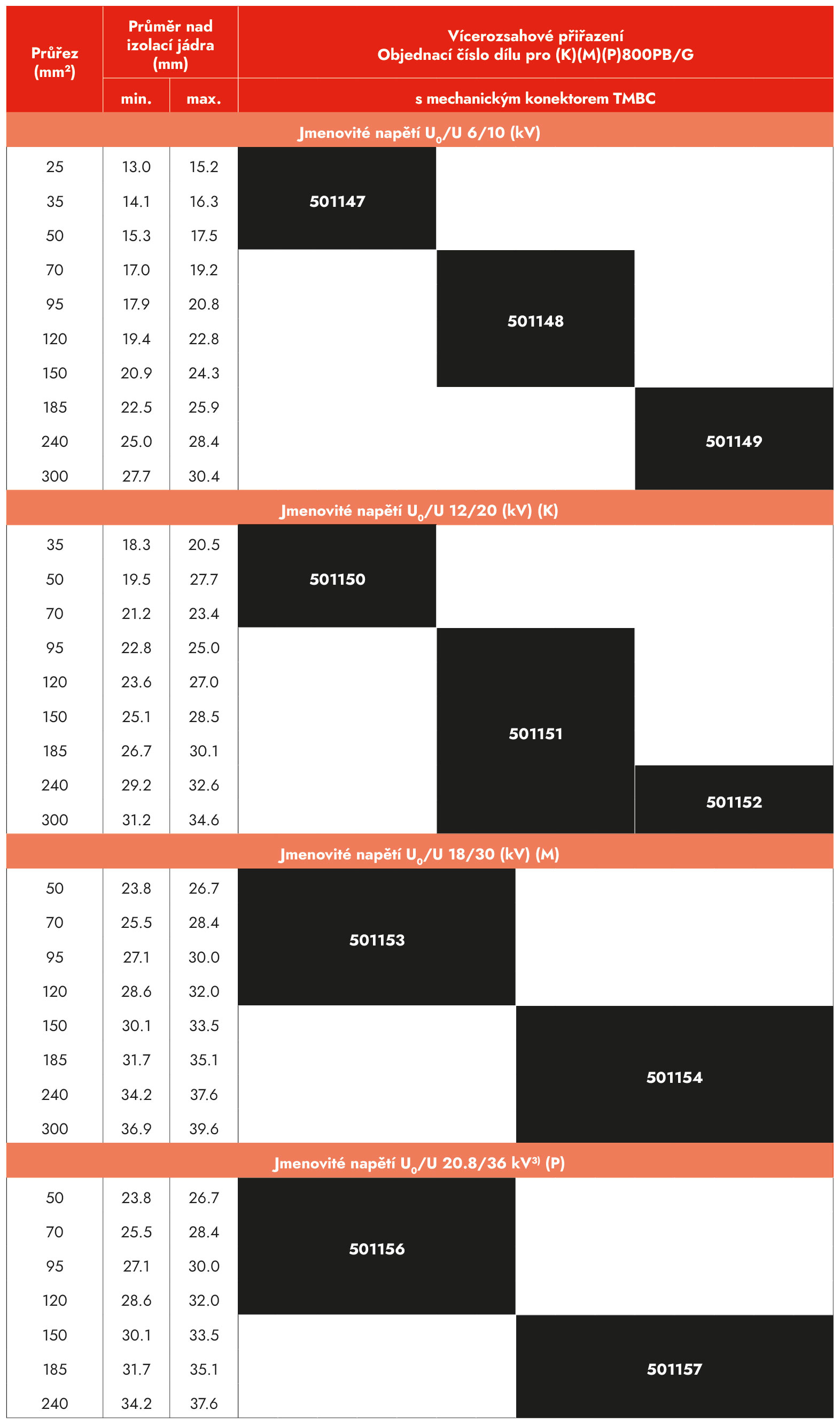 3) Vzhledem k tomu, že rozměry kabelů pro napěťovou hladinu 20,8/36 (42) kV ještě nejsou standardizovány, průřezy vodiče a přiřazené průměry nad izolací jádra uvedené v tabulce je třeba považovat za přibližné hodnoty. Při objednávání příslušenství uveďte ověřené průměry nad izolací jádra.
