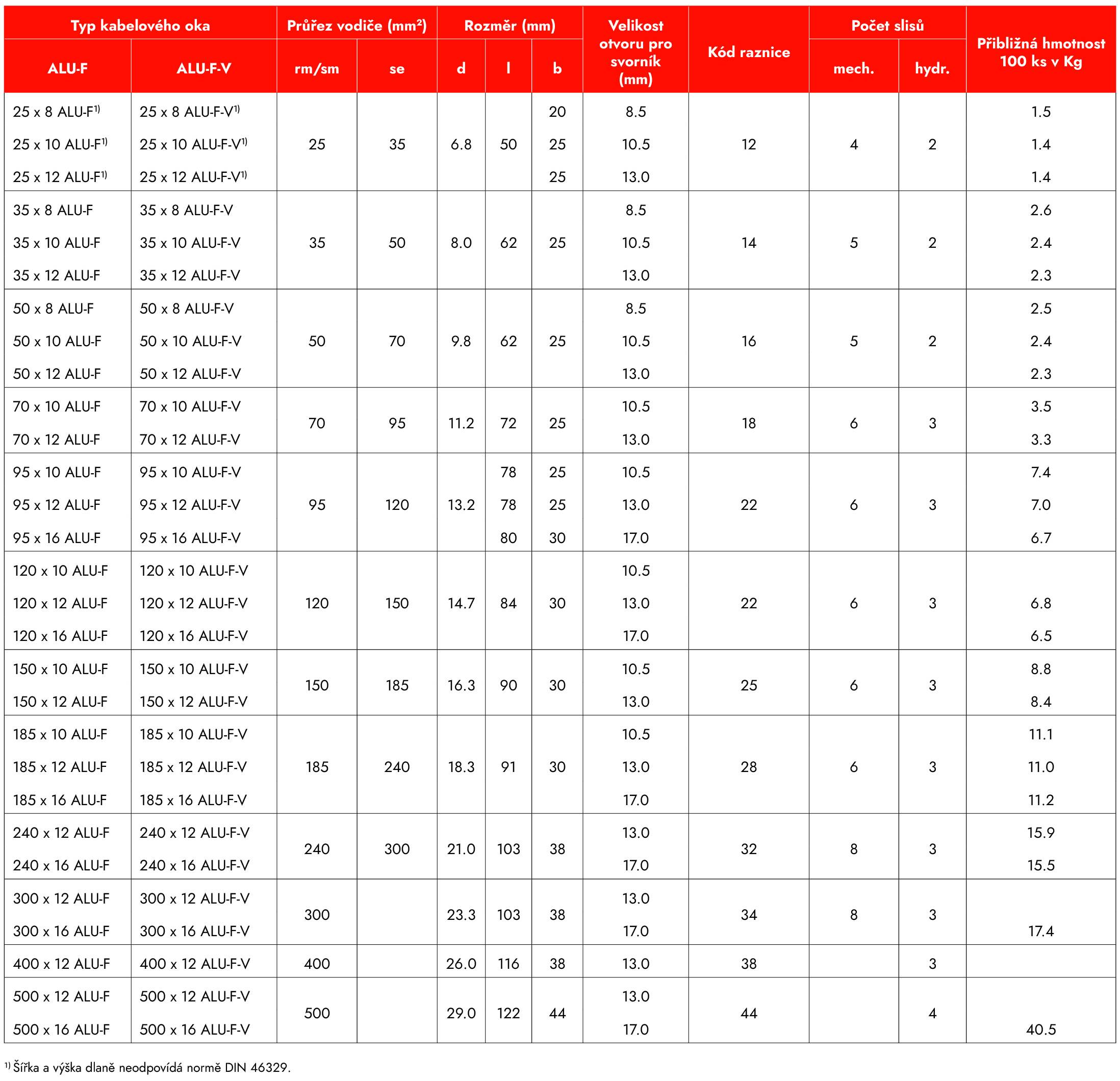 Lisovací kabelová oka, Al, podélně utěsněná, podle DIN 46329