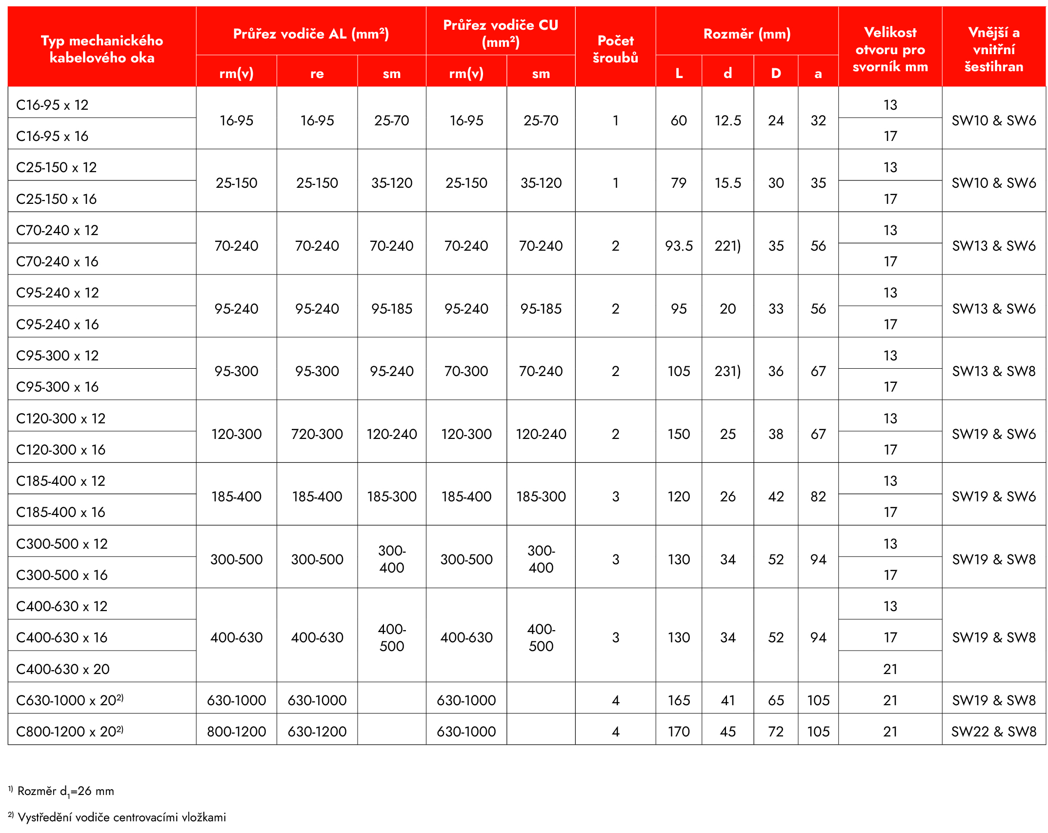 Průřez od 16 mm² do 1000 mm² pokrývají pouhé 4 typy kabelových ok.