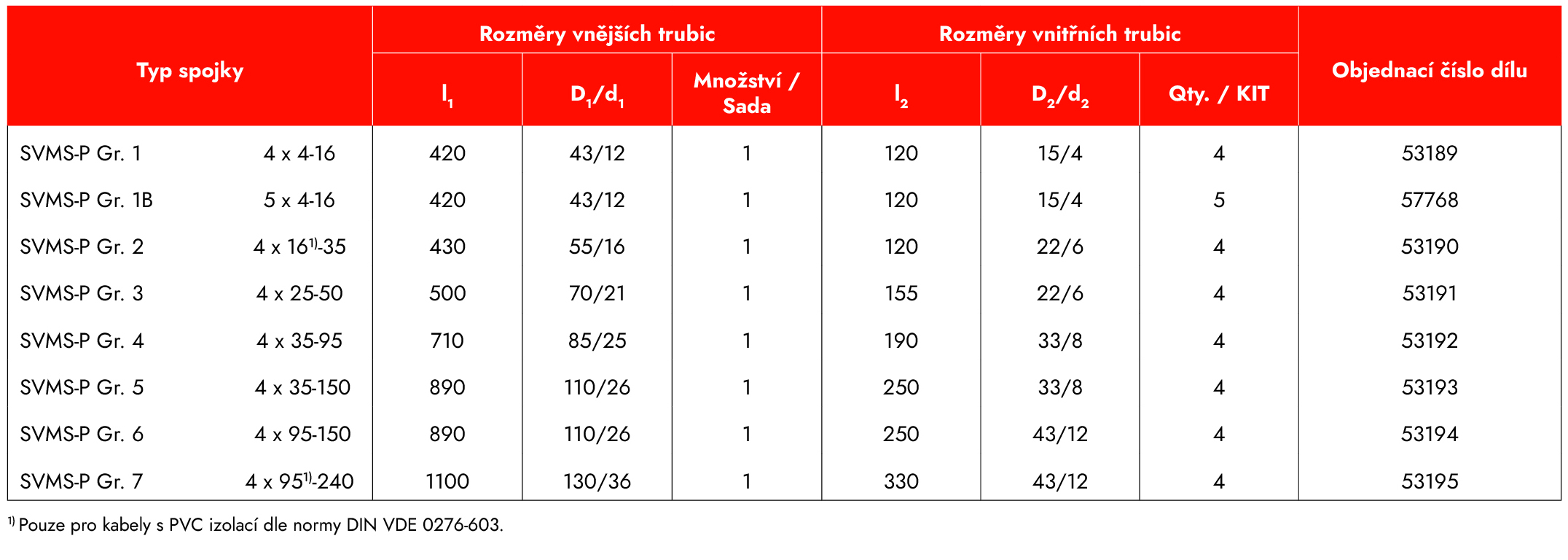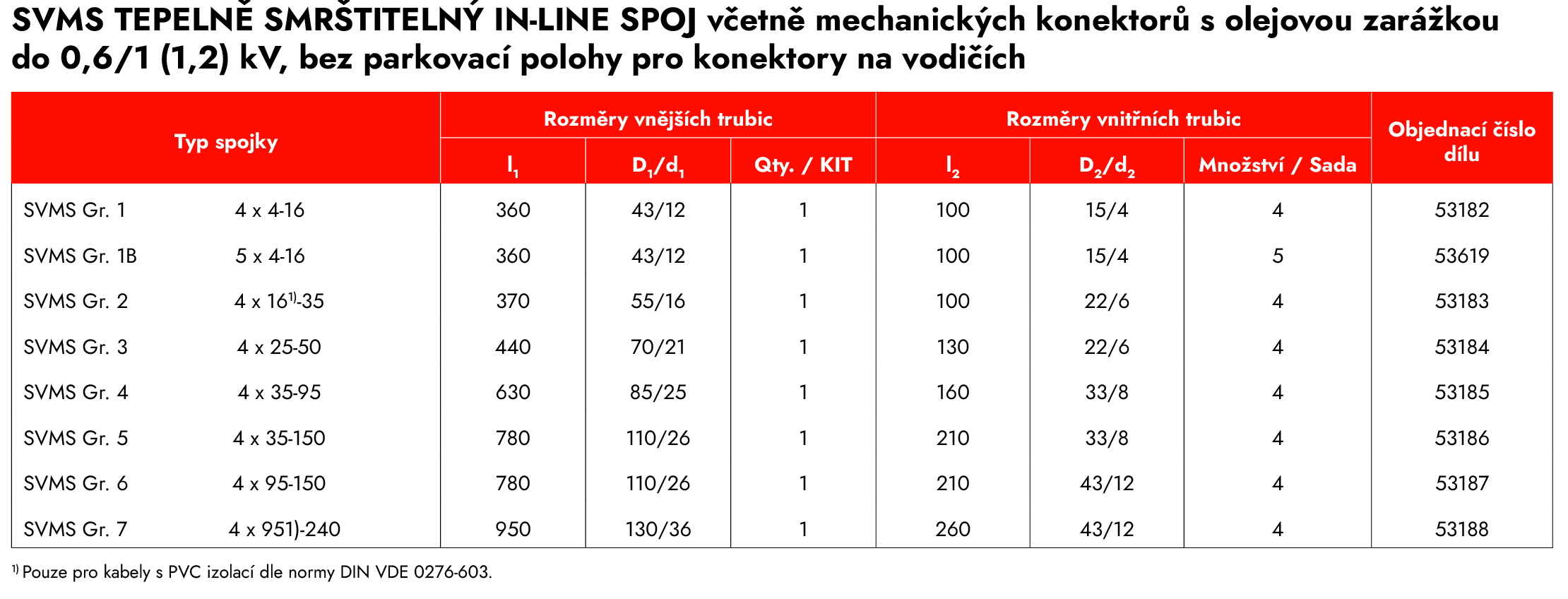 Teplem smrštitelná přímá spojka SVMS/SVMS-P se používá pro spojování čtyřžilových a pětižilových polymerem izolovaných kabelů s koncentrickým vodičem a izolací z PVC nebo XLPE a rovněž vnějšími plášti z PVC nebo PE. Spojky jsou určeny pro mechanické konektory měděných či hliníkových vodičů. Utěsnění těchto teplem smrštitelných spojek umožňuje vnitřní i venkovní použití.
