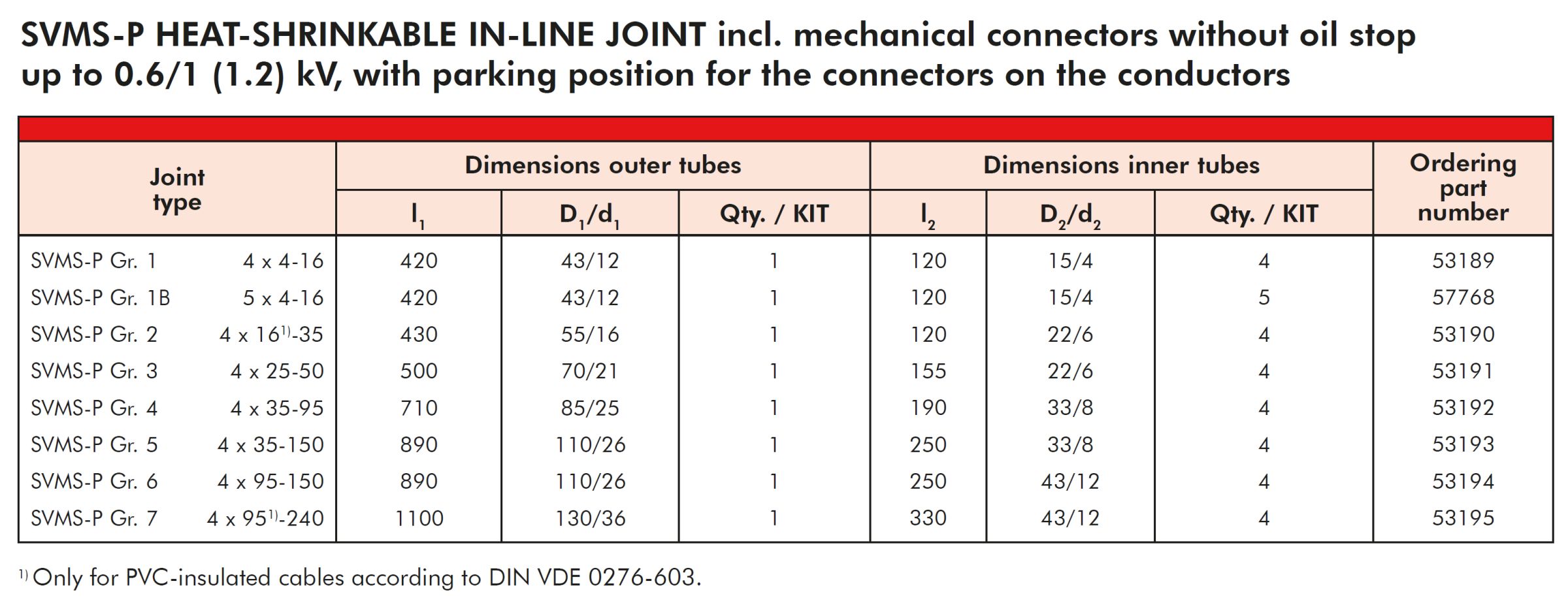The heat-shrinkable in-line joint SVMS/SVMS-P is used for jointing four- and five-core polymeric insulated cables with concentric conductor and PVC or XLPE insulation as well as PVC or PE outer sheaths. The joints are designed for use of mechanical connectors accommodating copper or aluminum conductors. This heat-shrinkable joints offer a sealed indoor or outdoor application.